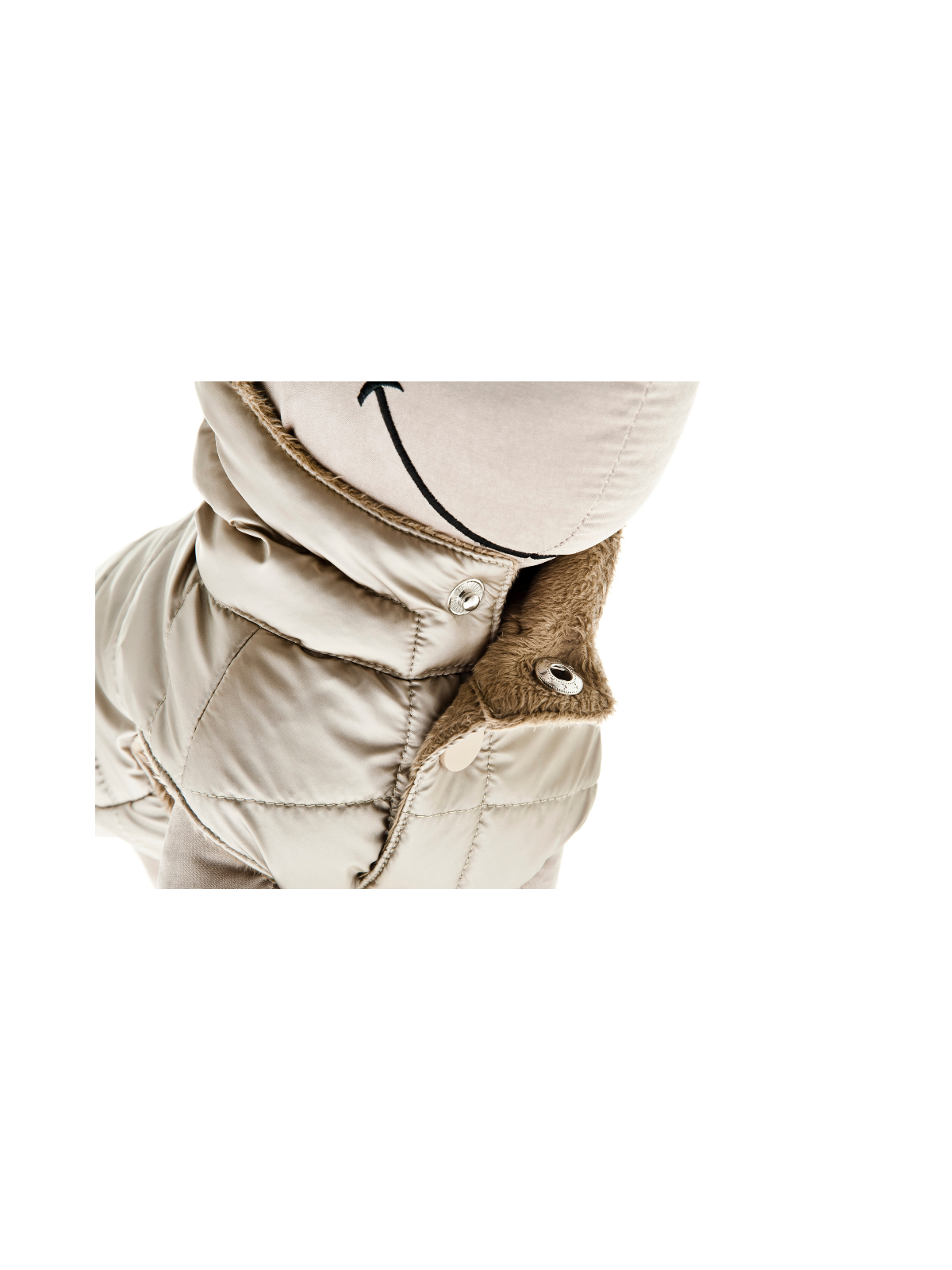The Cristallo Puffer Jacket features a quilted beige exterior with soft plush lining. Snap-button closures with single-button press make dressing easy. Adjustable elastic leg straps and eyelet for collar. Padded for warmth without bulk. Plush collar trim adds comfort and style.