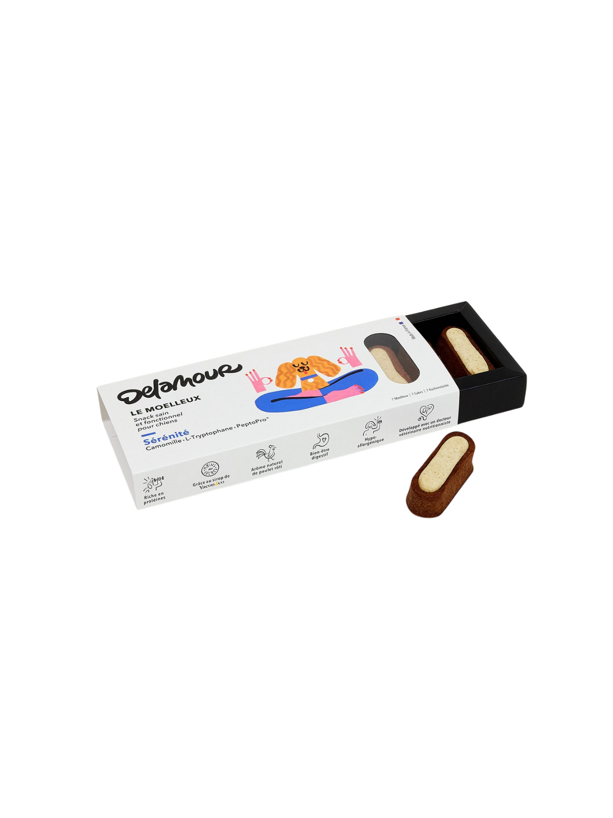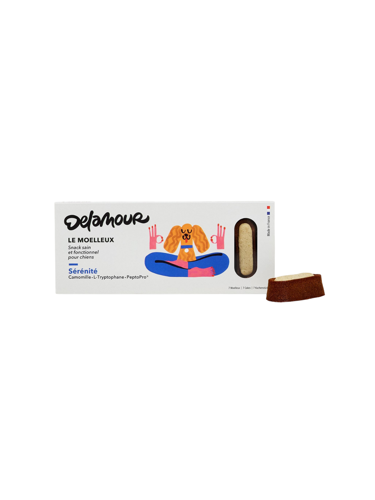 Le Moelleux Serenity is artisanal dog pâtisserie crafted in Le Mans, France, by master pastry chef Vianney Bellanger. Developed with a veterinary nutritionist, these perfectly balanced snacks combine indulgence with well-being. Le Moelleux Serenity helps soothe and calm your dog with a blend of medicinal plants and amino acids, while delivering delicious natural roasted chicken flavor. More than a snack — perfect for celebrations or everyday treats.