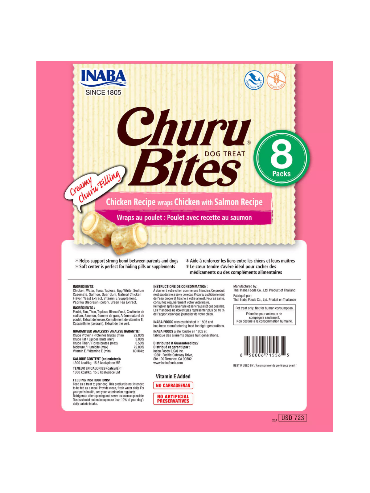 Inaba Churu Bites are made with high-quality chicken and salmon in soft, bite-sized portions. Each pack contains 8 individually portioned tubes—perfect for training rewards on the go. Enriched with vitamin E and green tea extract for added health benefits. Grain-free, preservative-free, carrageenan-free, and no artificial colors. Loved by even the pickiest eaters. Ideal for puppies and senior dogs.