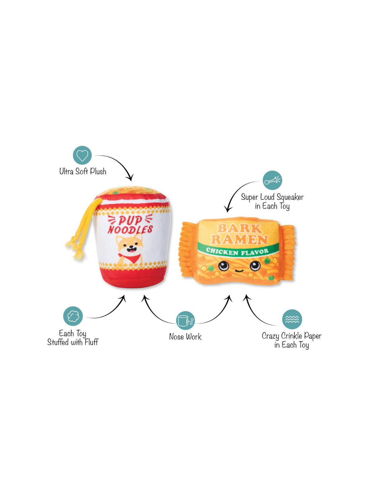 The Nothin' But Noodles nose work toy set by Fringe Studio is made for pups with energy who love interactive puzzle toys. This set includes 2 noodle-themed toys, each with a loud squeaker and crinkle paper. Hide treats inside the pocket, squeak the toy, and watch your dog figure out how to find the reward. A brain teaser that keeps playtime fun and mentally stimulating.