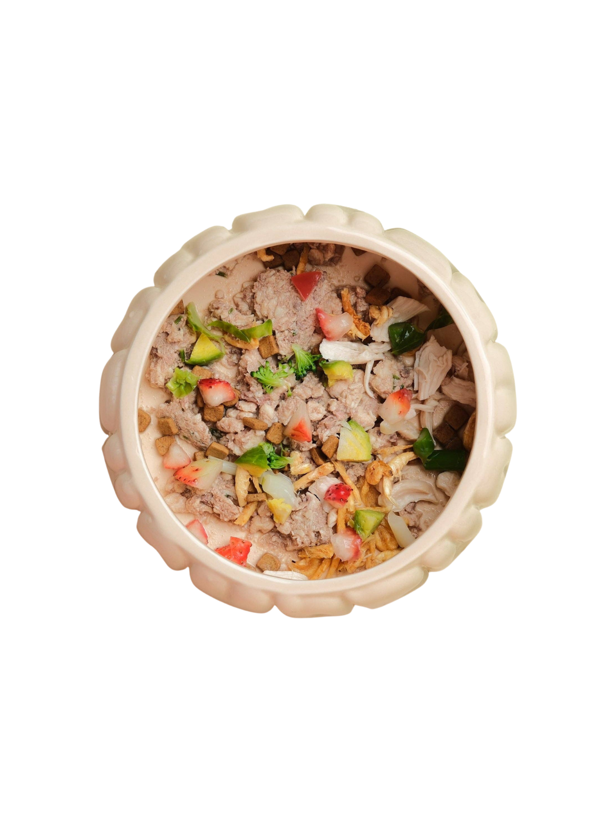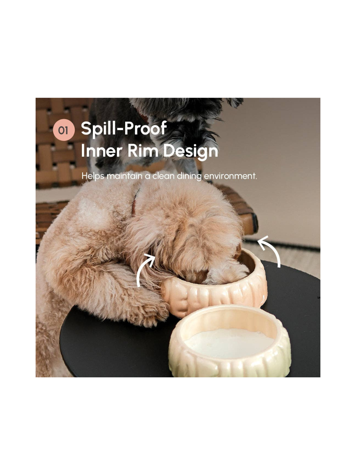 The PEHOM Puff Pet Bowl features a spill-proof inner rim design that helps maintain a clean dining environment. Smooth arc shape with one-piece molding and Puff logo design means no dead corners — making cleaning easier. Made from ceramic that's microwave and dishwasher safe, resistant to stains, and safe for food. Large base design provides stability and reduces the risk of tipping over. Non-slip silicone ring on the bottom ensures a quiet and comfortable feeding experience.
