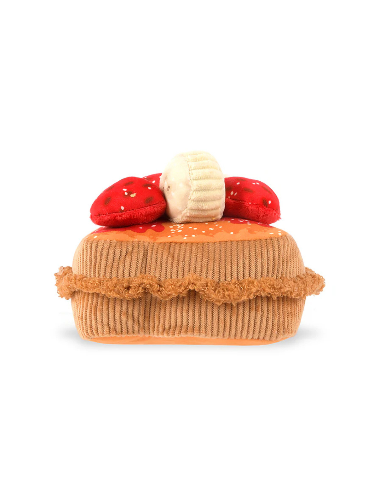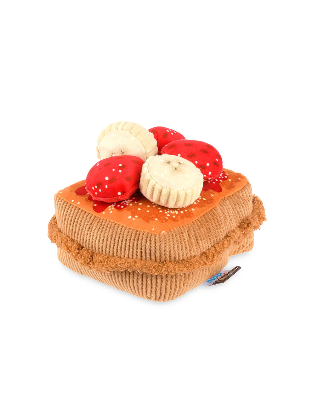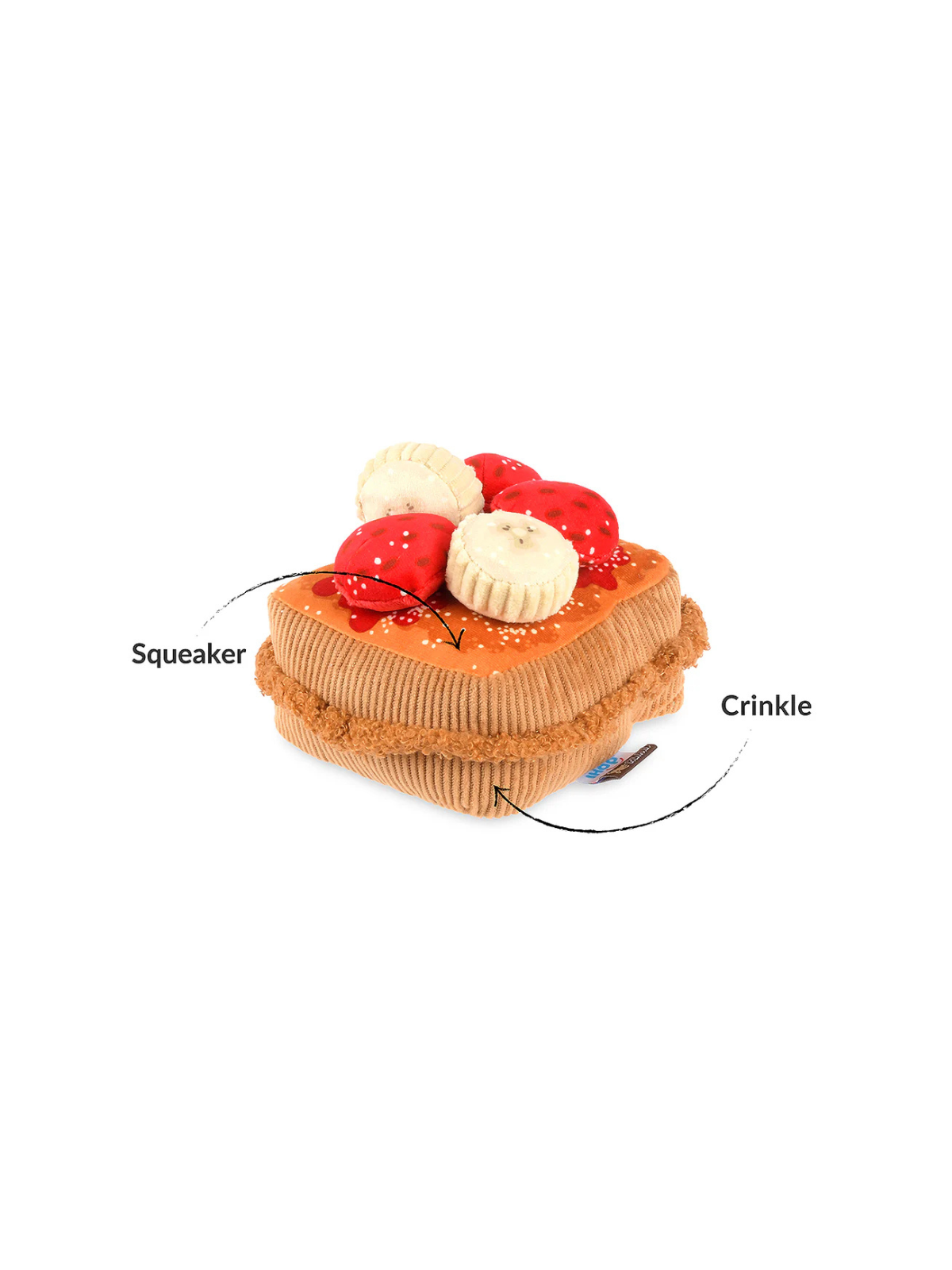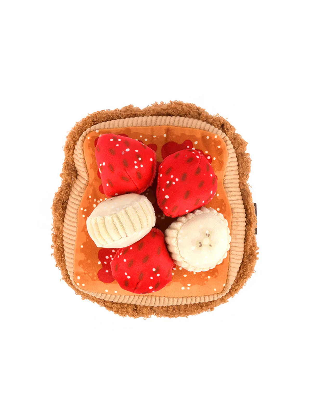 - Design: French toast with plush strawberries and bananas, squeaker and crinkle inside