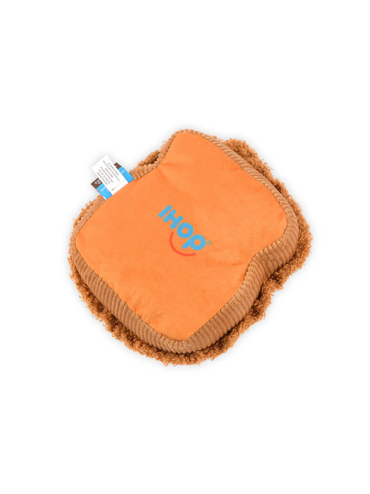The IHOP French Toast Toy brings breakfast vibes to playtime. This soft, squishy toy is perfect for snuggling or chewing, complete with a squeaker and crinkle. Features plush strawberries and bananas on top for an extra touch of breakfast magic.
