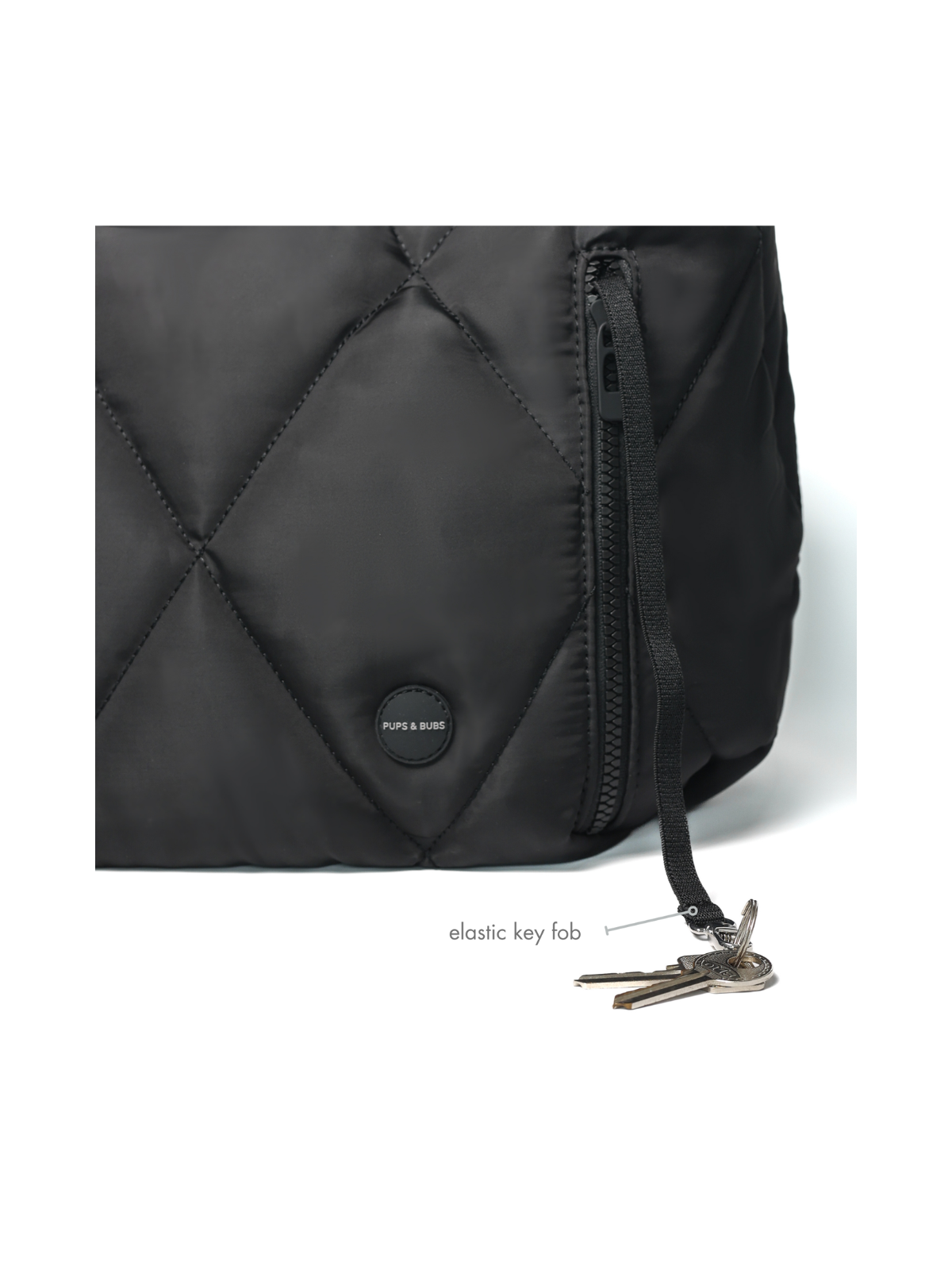 - Details: sturdy support board at bottom (removable to convert to regular crossbody bag), 2 zip pockets in front for phone/keys/valuables, elastic key fob